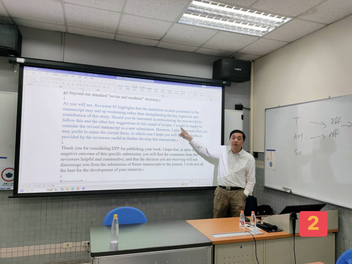 持續調整論證架構、強化論述邏輯,並有效回應審稿人意見。為協助學生更貼近編審思維,他以自身投稿經驗為例,展示論文